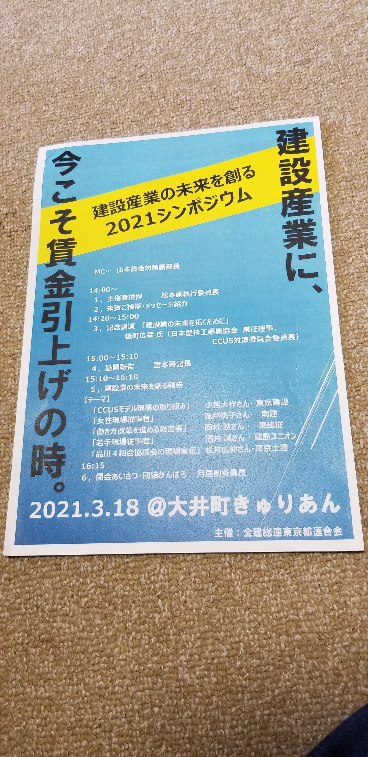 少し前になりますが3月18日に「大井町きゅりあん」にて開催されました、全建総連東京都連合会主催による「建設産業の未来を創る2021シンポジウム」において、記念講演『建設業の未来を拓くために』の講師を務めさせて頂きました。1420~1500までの40分間、CCUS(建設キャリアアップシステム)によってもたらされる産業の姿、その必要性について講演をしました。CCUSに対してはいまだに「メリットが感じられない」「何を目指しているのか不明瞭」「登録作業が煩雑過ぎる」などの厳しい意見が多いですが、建設産業が持続可能な産業に生まれ変わるためには、絶対に必要なインフラとなります。